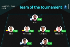 体育资讯9月10日讯 南美世预赛最后一轮比赛战罢,Sofascore根据球员本届南美世预赛的场均评分列出最佳阵容,梅西领衔,拉菲尼亚、J罗、迪亚斯、恩佐在列。