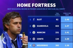 英超执教单一球队主场场均得分榜:斯洛特第一,瓜帅第二穆帅第五