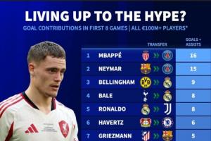 该榜单具体排名如下↓(只统计转会费>1亿欧元的攻击手,数据为进球+助攻)